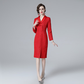 2021冬季新款气质小香风粗花呢西装连衣裙流苏收腰...