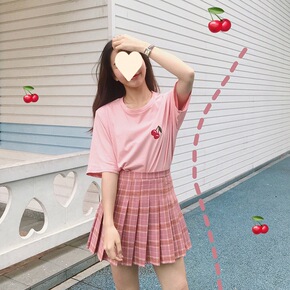 一件包邮2022春秋半身裙女粉格学院风格子高腰百褶...
