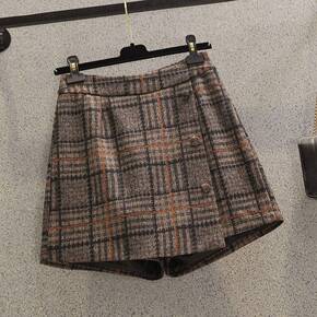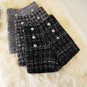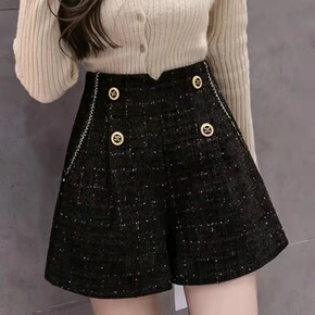 2022夏春装新款高腰显瘦小香风格子毛呢阔腿短裤女...