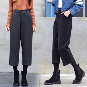 毛呢阔腿裤秋冬女高腰气质宽松休闲直筒长裤烟管呢子哈...