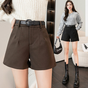 毛呢短裤女2022秋冬新款高腰阔腿裤外穿靴裤送皮带...