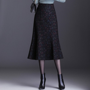 毛呢碎花鱼尾a字半身裙秋冬季女2022新款高腰包臀...