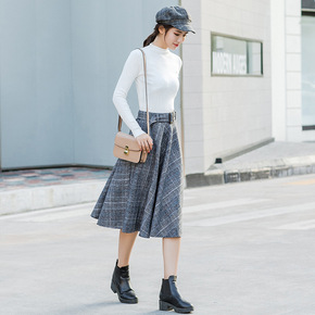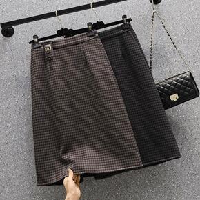 实拍秋冬大码格子加厚毛呢半身裙女胖MM中长款高腰a...