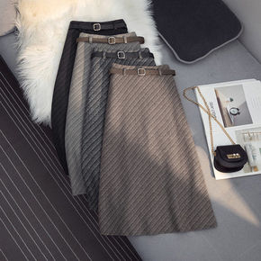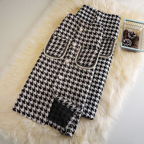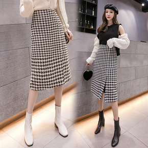 毛呢冬裙女新款加厚秋冬中长款复古千鸟格半身裙显瘦开...