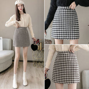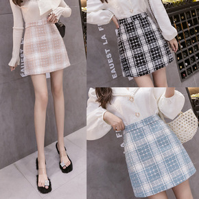 毛呢短裙女秋新款高腰裙子a字包臀裙千鸟格ins超火...