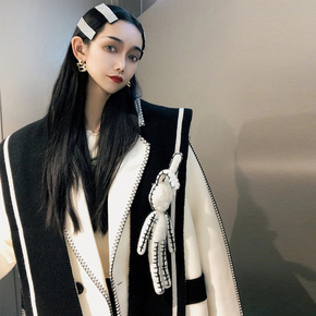 颗粒羊羔绒皮草毛呢外套连帽大衣2021秋冬新拼色显...