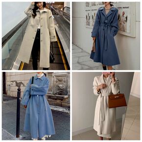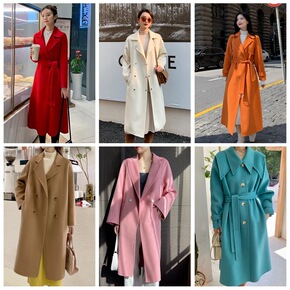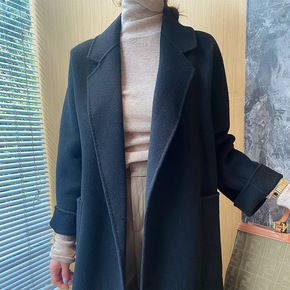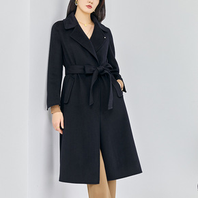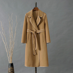 手缝纯手工双面羊毛大衣 翻领中长款系带腰带纯色双面...