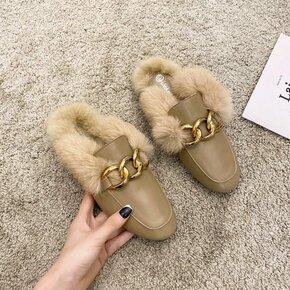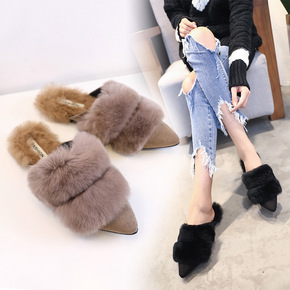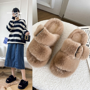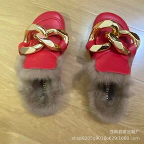 韩版真兔毛毛毛拖鞋女秋冬外穿2021新款低跟链条包...