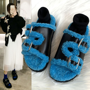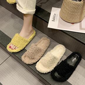 瑞网红羊羔毛拖鞋平底一字拖鞋2021秋冬新款女外穿...