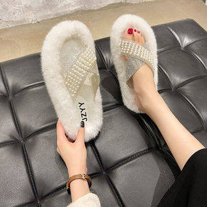 珍珠毛毛拖鞋女外穿2021秋季新款厚底防滑一字棉拖...