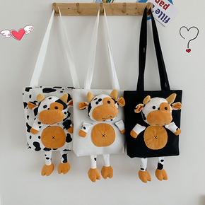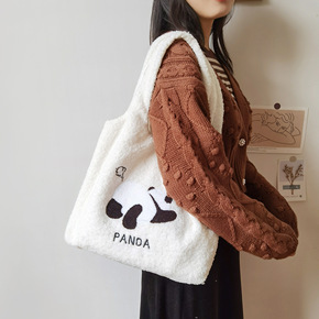 202冬季新款羊羔毛绣花熊猫可爱毛绒布包韩国学生大...