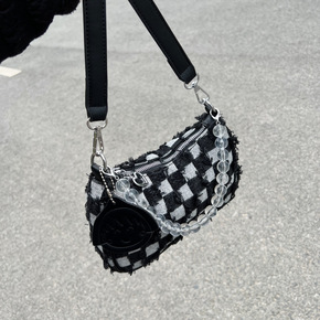 棋盘格毛边包包女2022夏季新款撞色格纹单肩腋下包...