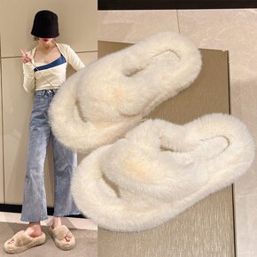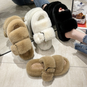 厚底毛毛拖鞋女2022秋冬季新款韩版交叉居家外穿棉...