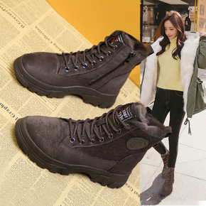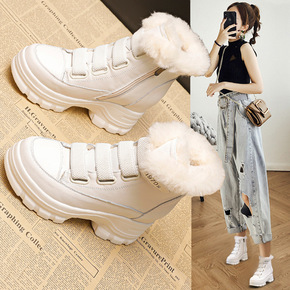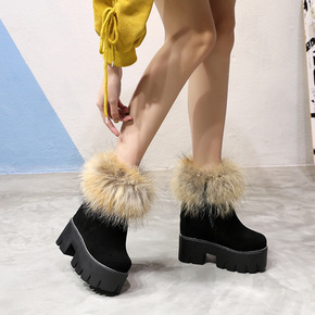 2020冬季冬季圆头加毛粘胶鞋现货人造毛高筒真皮黑...