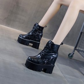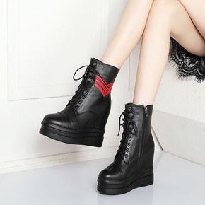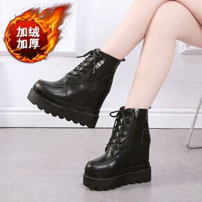 内增高坡跟中筒靴加绒厚底松糕底马丁靴侧拉链超高跟系...
