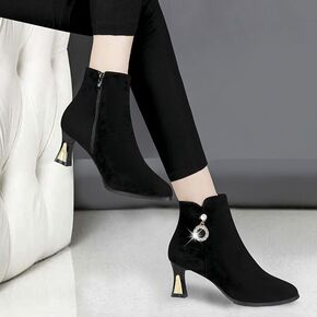 性感黑色尖头短靴女细跟高跟鞋秋冬加绒马丁靴及踝靴2...