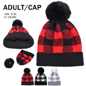 跨境外贸新款毛线帽格子可拆卸毛球卷边保暖圣诞针织帽...