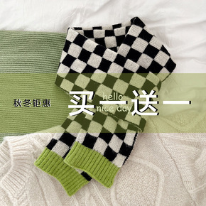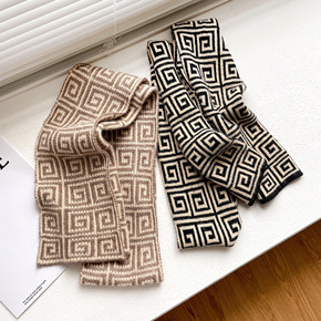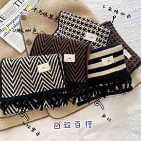 针织棋盘格子小众毛线围巾女秋冬季黑白格纹韩版百搭学...