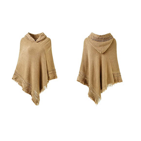 亚马逊跨境欧美秋冬款针织带帽斗篷披肩单色套头针织衫...