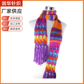 秋冬新款手工编织彩色流苏长围巾女士针织毛线厂家批发...