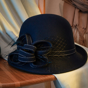 韩版秋冬季女羊毛呢帽子网纱绕花朵英伦复古渔夫盆帽百...