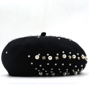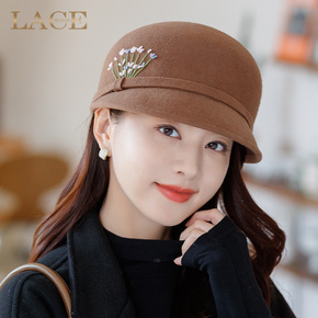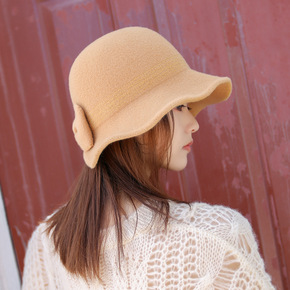 小众设计优雅百搭羊毛呢礼帽女韩版潮秋冬天珍珠简约盆...