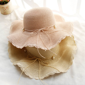 草编太阳帽女可折叠大檐波浪边串珠草帽夏天帽子防晒帽...