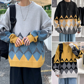 2021秋装新款外贸男士毛衣时尚潮流格子男士针织衫...