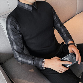 秋冬质感格子衬衫领毛衣假两件拼色针织套头毛衣男黑色...
