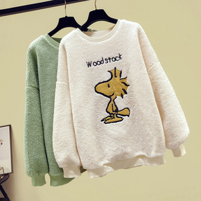 2021年秋冬新款刺绣羊羔绒中长款加绒加厚卫衣女宽...