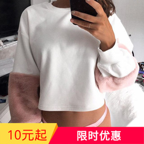 欧美速卖通新品秋冬季女装新款毛绒拼接长袖时尚圆领卫...