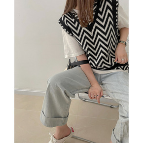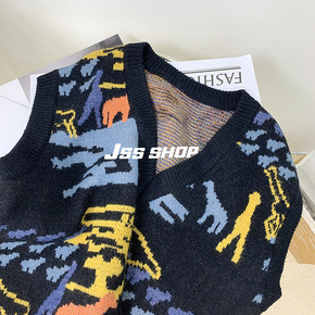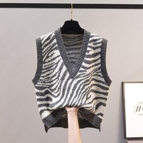 2021秋冬新款韩版斑马纹宽松V领针织马甲女复古时...