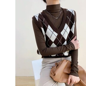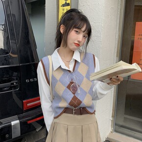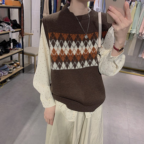 ins学院风马甲女2021秋季新款韩版复古V领菱格...