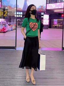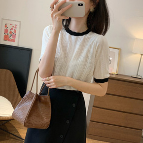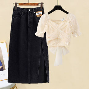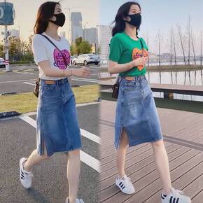 冰丝针织短袖T恤高腰牛仔半身裙两件套女2022夏显...