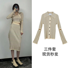 跨境套装2021秋冬新款名媛气质显瘦上衣+针织条纹...
