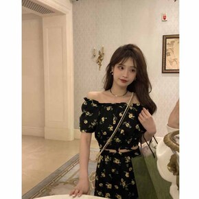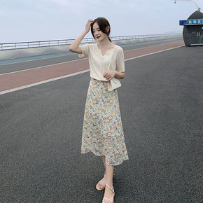 2022夏季新款法式小众复古V领碎花套装长裙油画风...