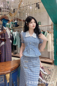 2022夏装新款两件套 韩版修身方领千鸟格上衣荷叶...
