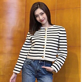条纹设计感复古慵懒风针织毛衣外套女装2022秋冬新...