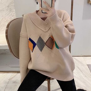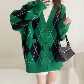 菱格毛衣外套女2022春秋新款复古日系加厚宽松V领...