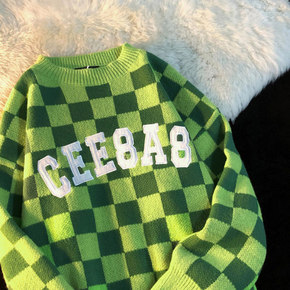 古着vintage绿色圆领毛衣女棋盘格子设计感小众...