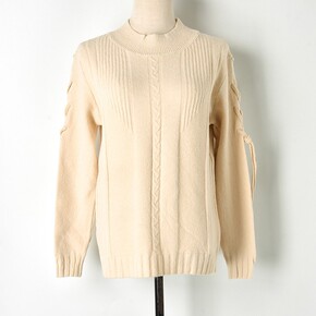 2018冬季新款半纯色袖子镂空绑带针织衫毛衣套头女...