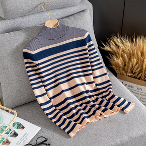 2022新款中高领秋冬新款条纹间色针织打底衫内搭修...