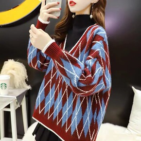 2022年秋冬假两件半高领毛衣女套头针织衫宽松格子...