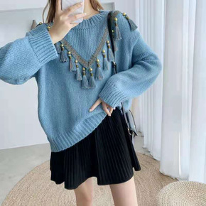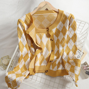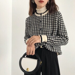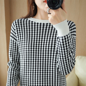 加厚保暖千鸟格圆领套头打底毛衣女短款宽松内搭棉线针...