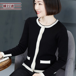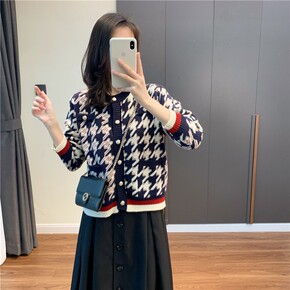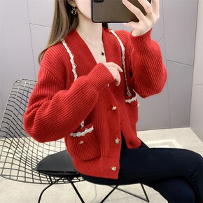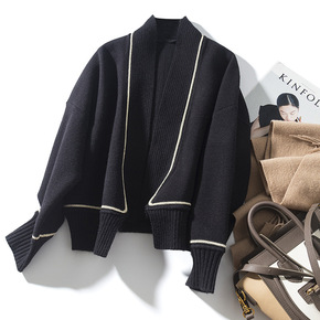 法式气质撞色金线编织加厚羊毛针织开衫外套女短宽松长...