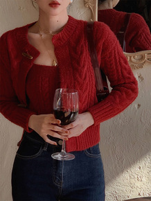 春装2022新款红色针织开衫毛衣女别致高级吊带上衣...