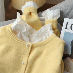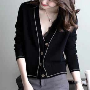 蕾丝花边拼接荷叶边V领毛针织开衫女2022秋冬装新...