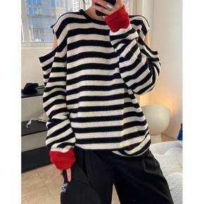 早春新款韩国东大门时髦休闲露肩设计条纹毛衣宽松软糯...