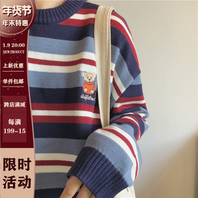 2021冬/美式复古风 宽松慵懒百搭休闲圆领条纹小...