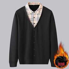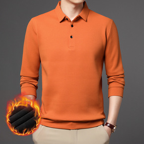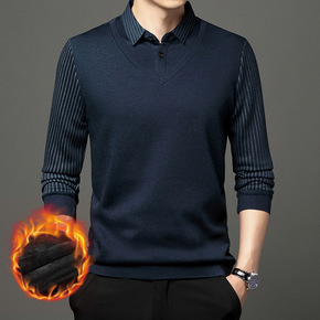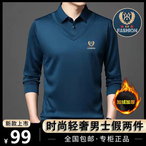 秋冬男士假两件T恤中青年翻领长袖加绒加厚保暖商务打...
